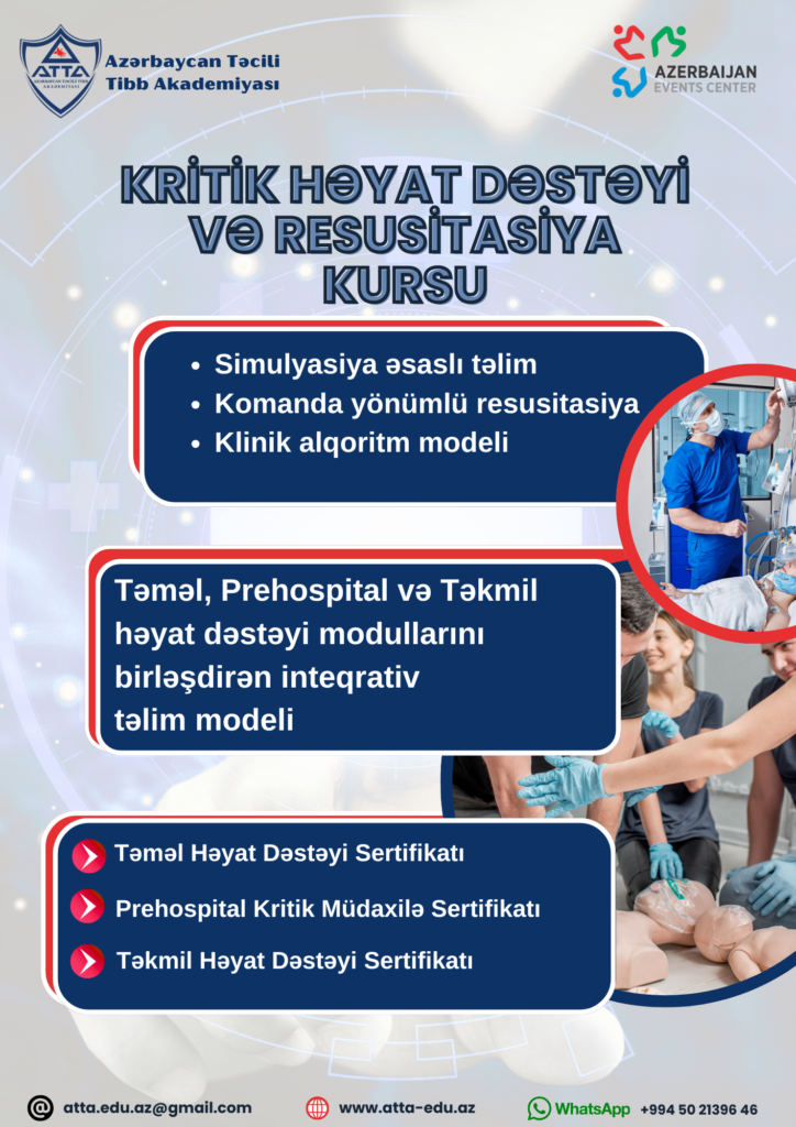 Azərbaycan Təcili Tibb Akademiyası (ATTA) və Pasiyent Təşkilatları İttifaqının (PTİ) əməkdaşlığı çərçivəsində səhiyyə işçiləri üçün “Kritik Həyat Dəstəyi və Resusitasiya Kursu” adlı strukturlaşdırılmış klinik təlim proqramının təşkili planlaşdırılır. Tədbir Bakı və regionlarda silsilə şəkilində olacaq.